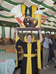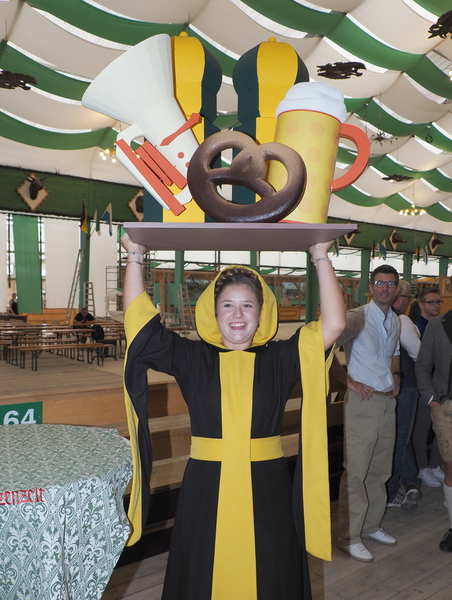 Tablett in die Höhe hält. Darauf thronen die Frauenkirche, eine Brezn, eine Tuba und selbstverständlich ein Maßkrug.
