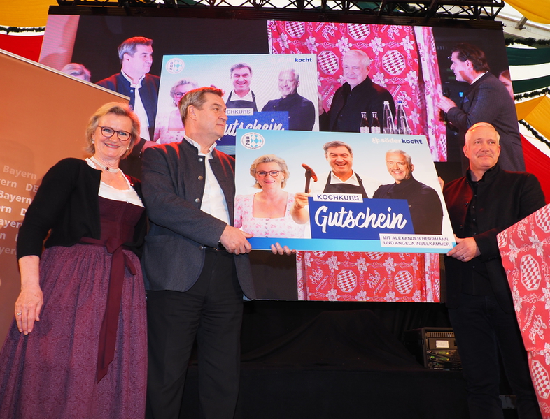 Da Söder ja gerne isst, wie seine Beiträge auf TikTok und Facebook beweisen, bekam er als Gastgeschenk einen Gutschein für einen Kochkurs mit TV-Koch Alexander Hermann und Angela Inselkammer, inklusive einer Kochjacke.