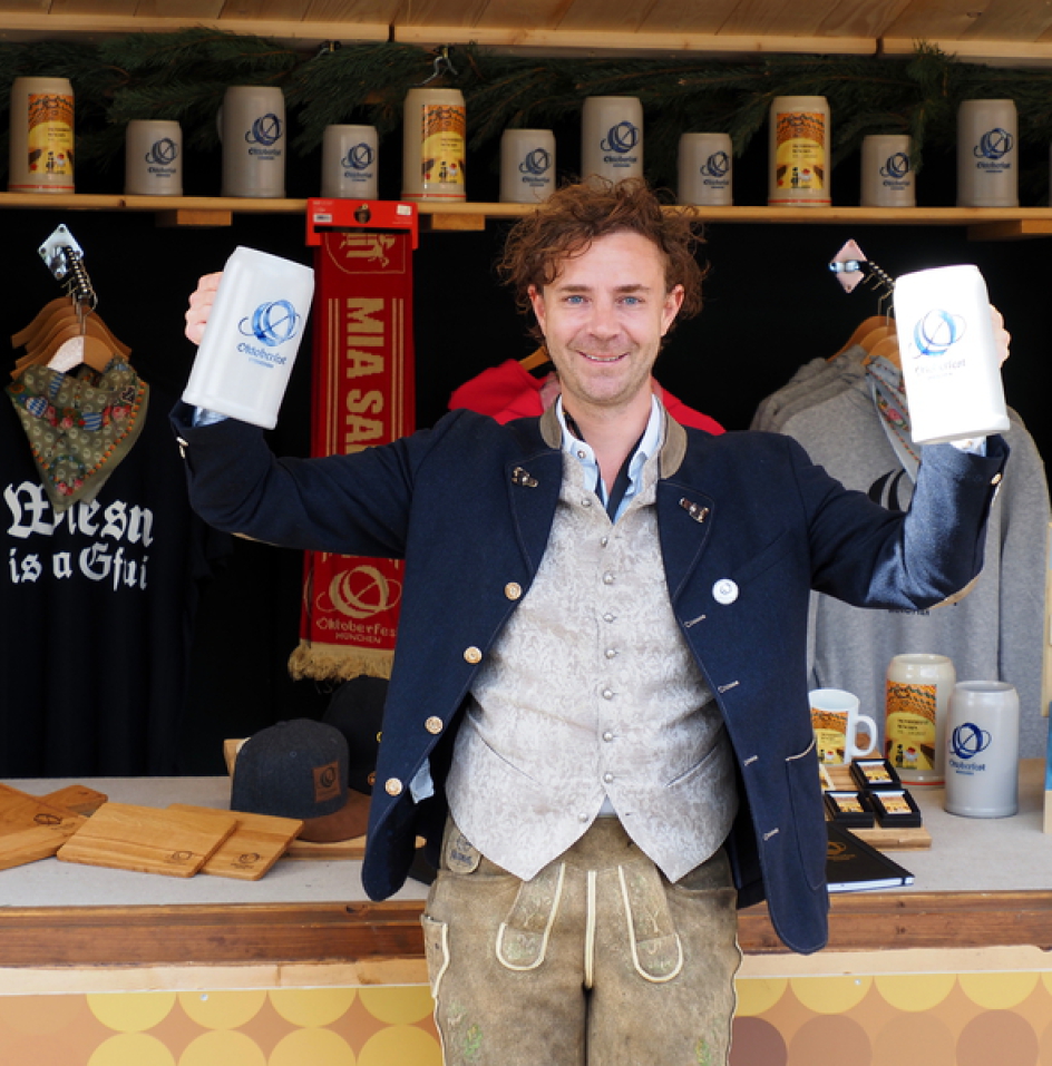 Beim Haupteingang zur Wiesn gibt es einen neuen Infostand der Stadt München. Hier kann der Besucher Souvenirs mit dem neuen Oktoberfestlogo kaufen.
