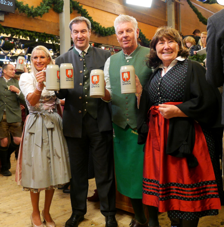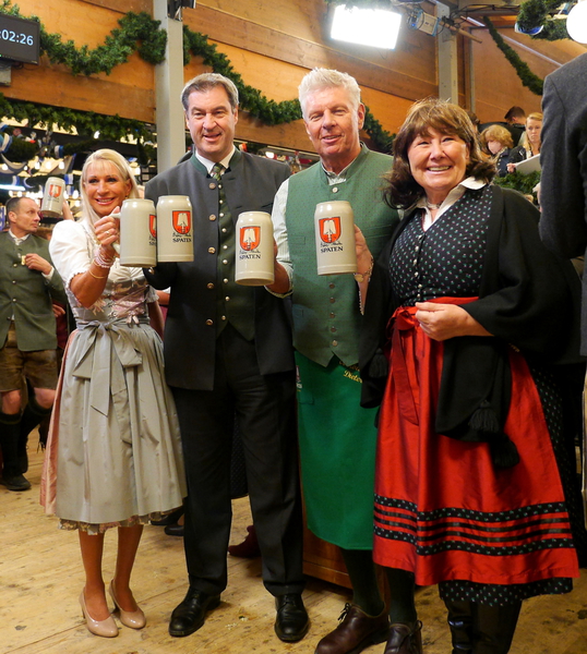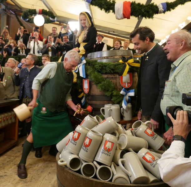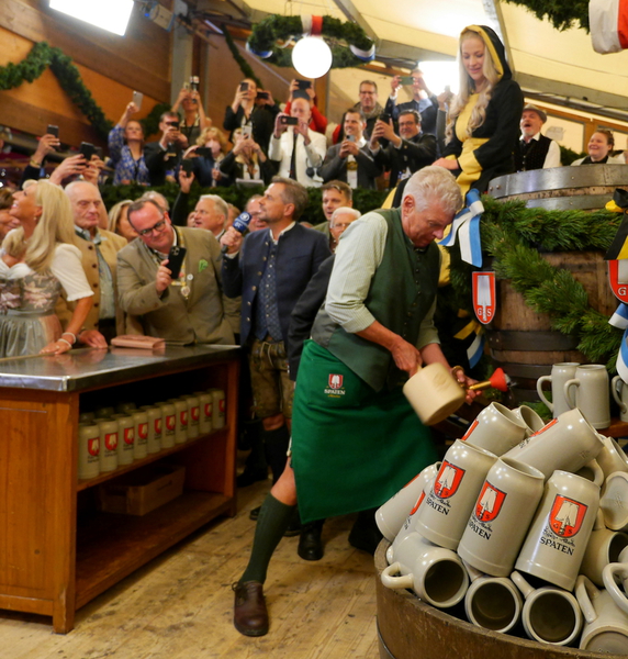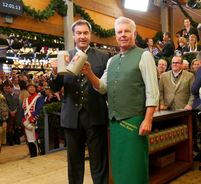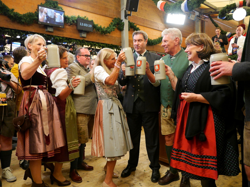Mit drei Schlägen zapfte Münchens Oberbürgermeister Dieter Reiter (SPD) das erste Fass Bier an. Die erste Mass erhielt wie immer Ministerpräsident Markus Söder (CSU), der vorher noch ein bisserl Wahlwerbung gemacht hat. Söder "Jeder soll auf dieser Wiesn anziehen, was er will, jeder soll essen, was er will, und wenn hier mal die Band ein Lied spielt, das nicht jedem gefällt, dann soll auch jeder singen können, was er will."
