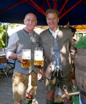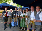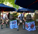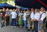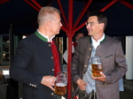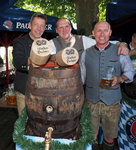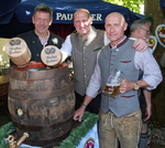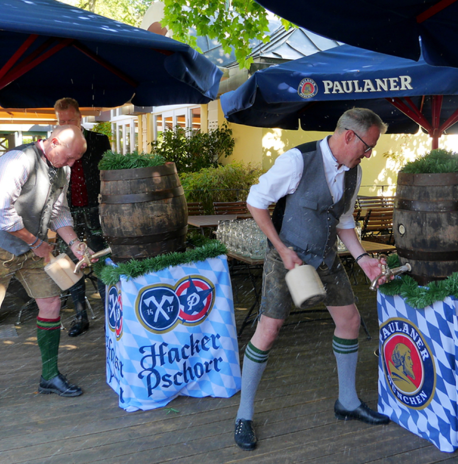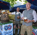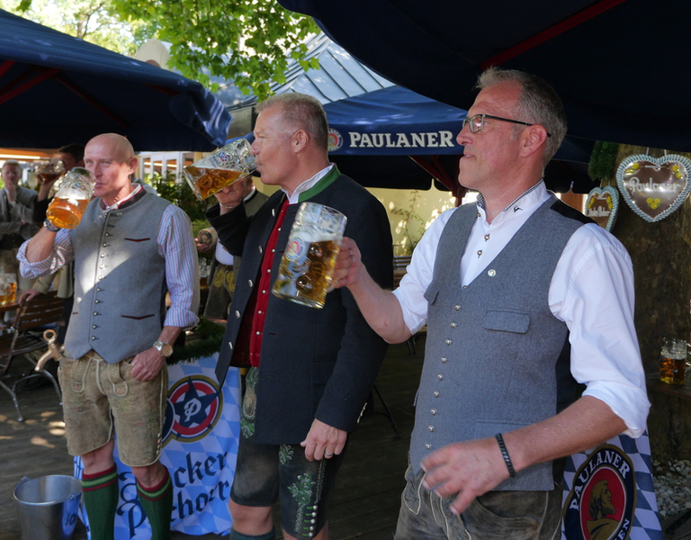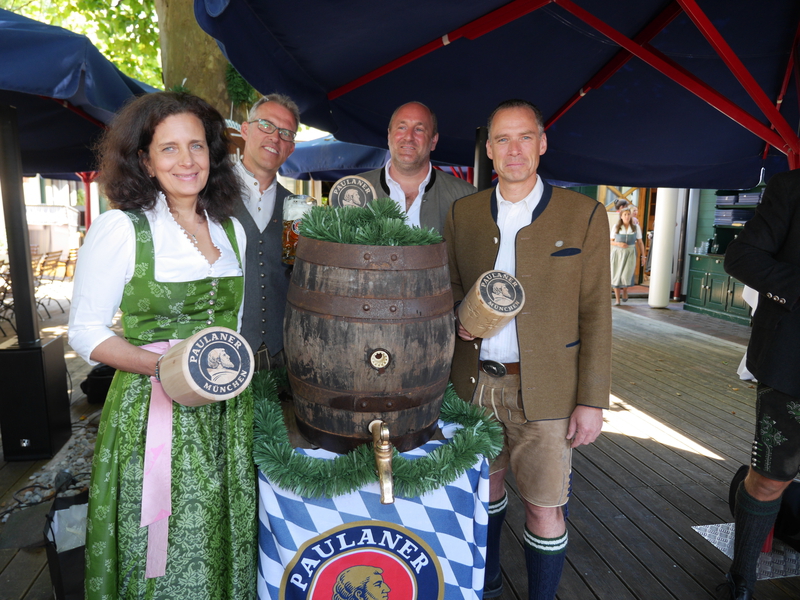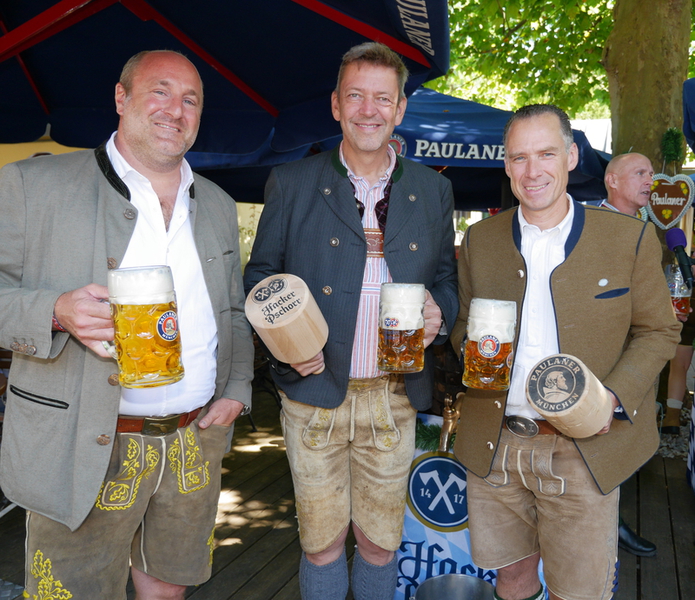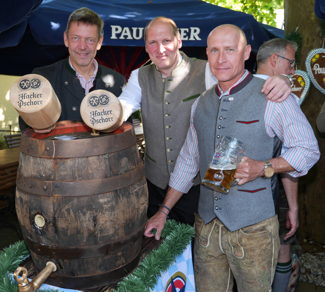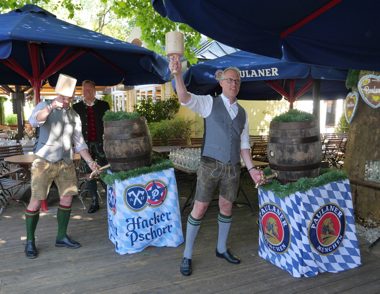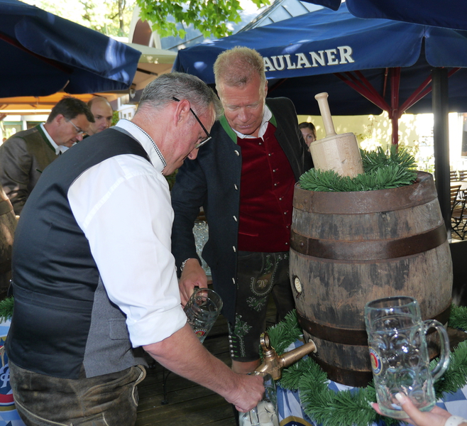 Dann kam der Ruf auf den alle gewartet haben: “O’zapft is“. Christian Dahncke und Rainer Kansy haben fast synchron die beiden Fässer Paulaner und Hacker-Pschorr angezapft. Unterstützt wurden sie