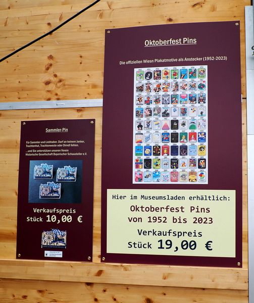 Im "Museumsstandl" haben Gäste die Möglichkeit, exklusive Nachdrucke der Oktoberfestplakate von 1952 bis 2018 zum Preis von nur 12 Euro pro Stück zu erwerben, sowie Pins zum Preis von 19 Euro.