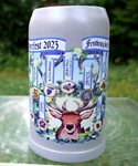Gestaltet hat den Festkrug jetzt schon zum zweiten Mal der Grafiker Rudi Skukalek. Der Münchner arbeitet seit rund 20 Jahren als Illustrator für Print, Online und Film. Der Künstler: „Auf dem Festkrug zeigt sich ein stattlicher, fesch herausgeputzter Hirsch, der uns stolz sein beachtliches Geweih präsentiert. 15 Medaillen mit kleinen Bild-Emblemen schmücken es aus. Jede dieser Medaillen steht für eines der Festzelte.“ Vom Hammel (Schottenhamel) bis zum Pferd (Marstall), vom Marienkäfer (Käfer) bis hin zum Filzhut (Festzelt Tradition). Vom bayerischen Himmel (Hacker) bis hin zu Zielscheiben (Armbrust- und Schützenzelt).