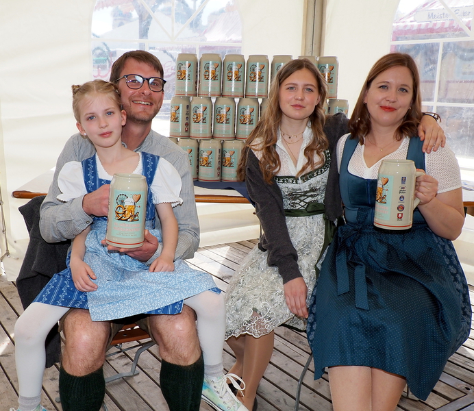 Die Maß wird heuer wieder im traditionellen Frühlingskrug ausgeschenkt – gestaltet von der Familie Srb. „Wir haben die Ausschreibung zufällig im Wochenanzeiger entdeckt und einfach mitgemacht“, sagt Daniela Lange-Srb. Ihr Entwurf, erstellt mit Hilfe künstlicher Intelligenz, zeigt Brezn, Bier, Riesenrad und Herzluftballon – mit den Schaustellern im Mittelpunkt.